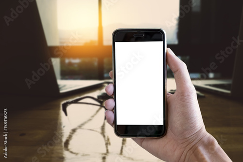 Close up man hold smartphone with blank screen mobile and business discussion in office blurred background.
