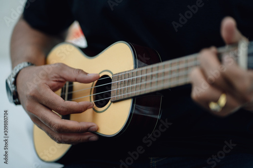 Close up man's hands playing the ukulele, concept ralax or artist.