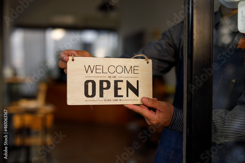 Close up of Store owner turning open sign broad through the door glass and ready to serve. hotel service, cafe-restaurant, retail store, small business owner concept