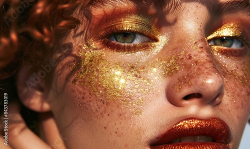 closeup, woman, gold, glistering, make-up, photo, shoot, beauty, mag, ginger, hair, daylight, soft, light, fashion, photo, glamourous, radiant, detailed, vibrant, elegant, chic, stylish, sophisticated, stunning, captivating, glowing, luxurious, photogenic, exquisite, refined, polished, artistic, aglow, striking, shimmering, editorial, trendy, contemporary, expressive, enchanting, mesmerizing, alluring, face, eye, model, make-up, lip