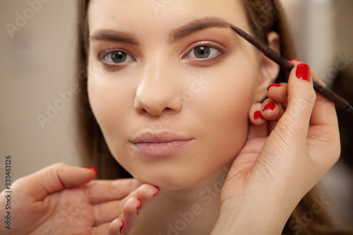 Close up of a charming young woman getting professional makeup done, makeup artist using eyebrow pencil