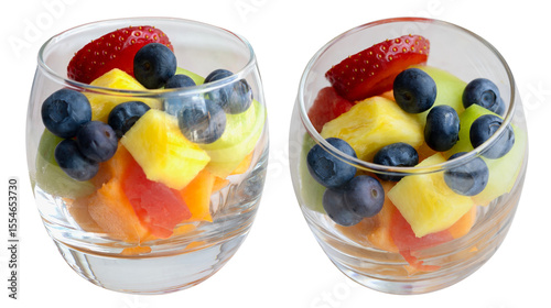 close up of a colorful fruit salad in small glass bowl isolated on white, side view, top view.