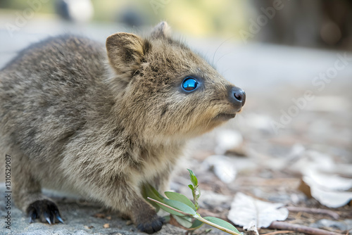 Close up of a curious Quokka with bright blue eyes looking into the camera