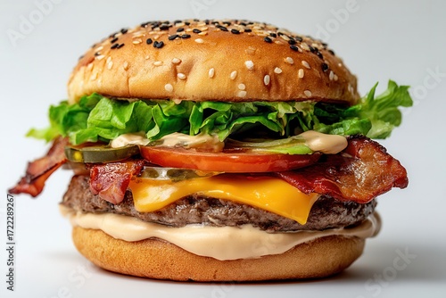 american, hamburger, lettuce, cheeseburger, cheddar, fast, burger, sandwich, tomatoes, seed, mayo, bacon, pickle, sesame, bun, grilled, beef, eatery, lunch, eat, sauce, cheese, food, dinner, meal, cooked, cookery, delicious