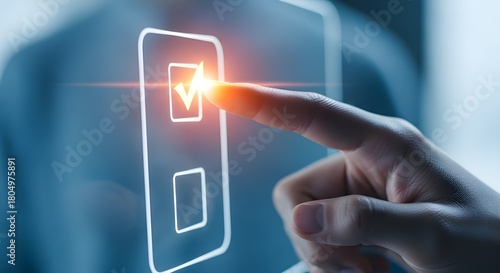 Close up of a finger touching a glowing digital interface with a checkmark icon