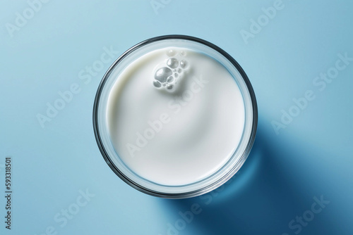 close up of a glass of fresh milk, isolated on a light blue background, top view, created with generative ai