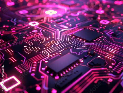 Close up of a glowing pink circuit board, representing technology and innovation.