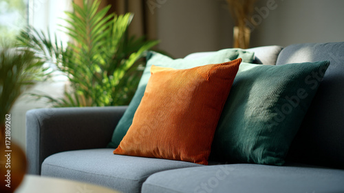 sofa, pillow, home, decor, cushion, living room, indoor, furniture, houseplant, design, textile, comfort, relaxation, interior, style, modern, cosy, orange, green, grey, plant, window, daylight, soft, fabric, corduroy, arrangement, elegant, contemporary, still life, closeup