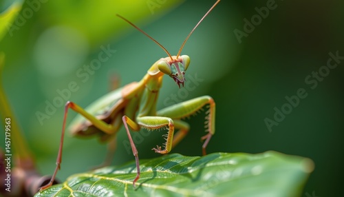 Close Up of a Green Mantis on a Leaf in Natural Light Environment