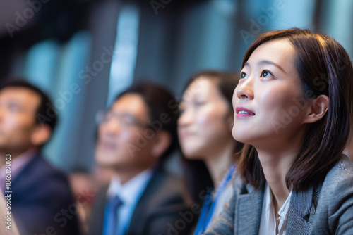 Close up of a Group of people attend corporate event. Asian business Audience watches projection screen with sustainability presentation . Professionals learn in classroom setting. Teamwork, education