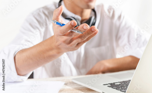 Close up of a hand with a pencil of young businessman in white shirt at home office use a laptop computer taking notes at the office thinking and explaining about work while online meeting video