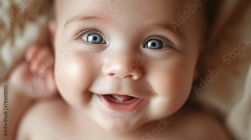 Close up of a happy baby with bright blue eyes. Suitable for parenting blogs or advertisements