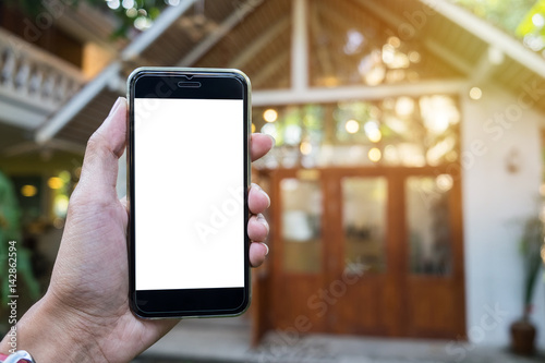 Close up of a man using smartphone with blank screen mobile outdoor.