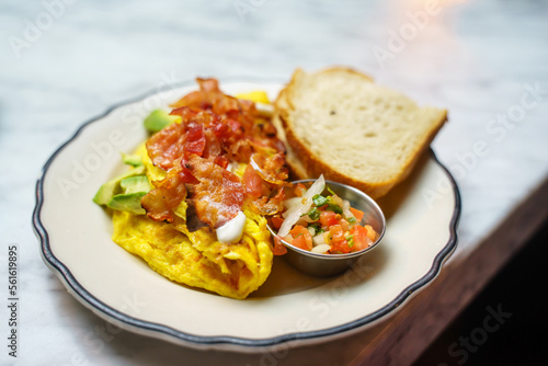 Close up of a plate of bacon, fried eggs and sandwich for breakfast. Good idea for a fancy breakfast and relaxing life. The egg is fried and mixed with spinach, topped with chopped tomatoes, jalapeno