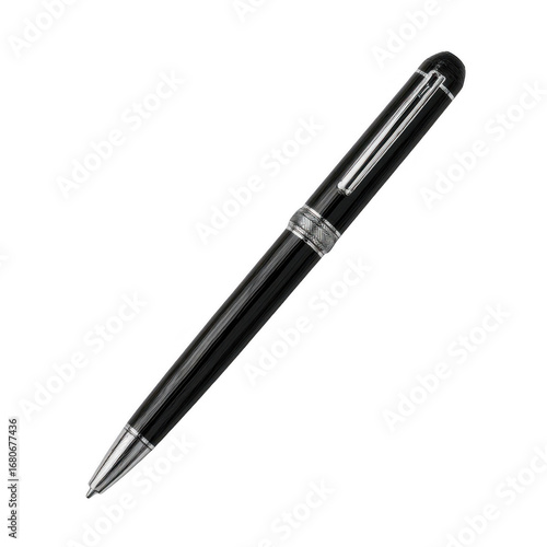 Close up of a sleek black ballpoint pen with silver accents isolated on a white background