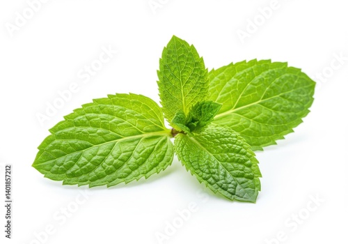 Close up of a sprig of fresh mint leaves on a white background in bright studio lighting setup