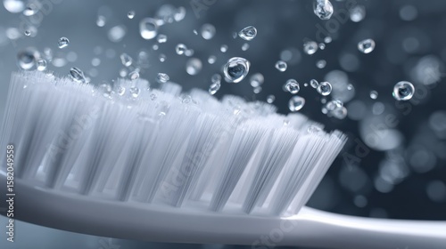 Close Up of a Toothbrush with Glimmering Water Droplets Highlighting Freshness and Cleanliness in a Bright and Inviting Bathroom Setting