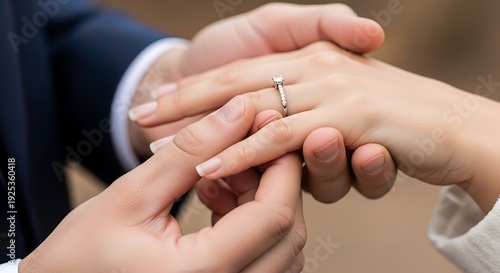 Close up of a wedding proposal with a diamond ring on a woman's finger