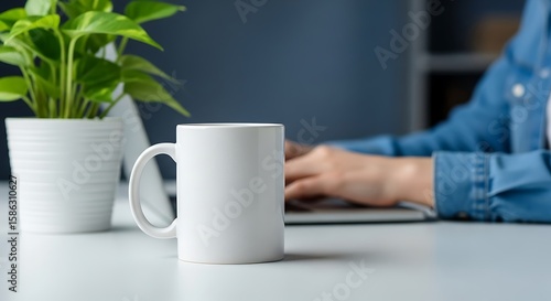 Close up of a white mug on a desk with a plant and a person typing on a laptop in the background