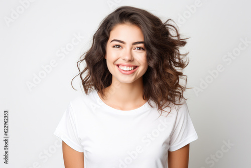 Close up of a young woman smiling and wearing a white t-shirt on a white background. Generative AI