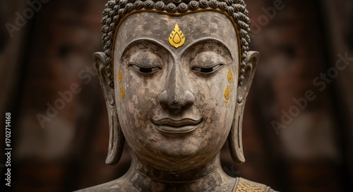 Close up of an ancient buddha statue face, adorned with gold leaf, representing peace and spiritual enlightenment in buddhism culture.