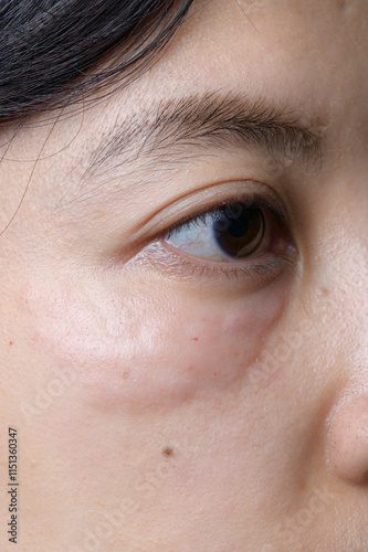 Close up of Asian woman eye with visible under eye swelling and skin texture