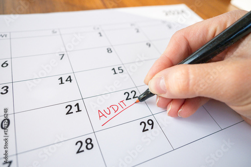 Close up of audit written on date with red marker. Hand marking audit date on calendar