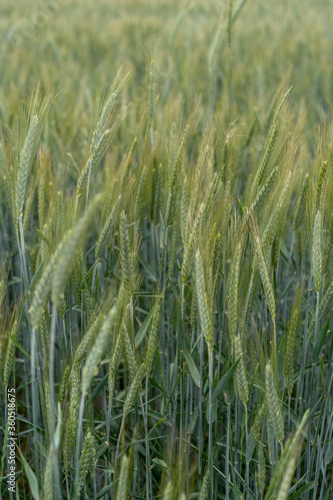Close up of barley ear with green field on the background