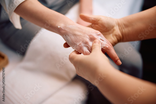 Close up of beautician applying moisturizer on woman's hands during skin care treatment.