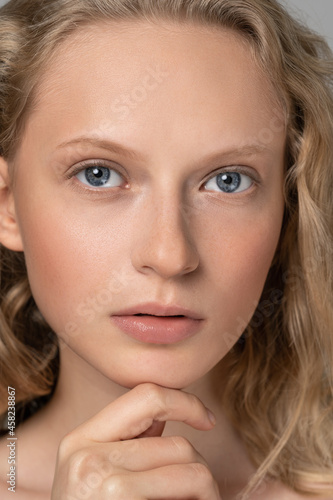 Close up of beauty woman face portrait with blue eyes and curly hair. Spa model girl with perfect fresh clean skin. Blond female looking at camera and touching her chin. Youth and skin care concept.