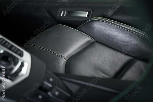 Close up of black leather car seat