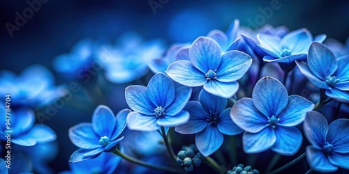 Close up of blooming blue flowers on dark floral background, flowers, blooming, blue