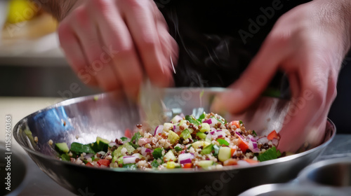Close up of chef hands mixing colorful grain bowl with fresh vegetables, showcasing art of healthy cooking. vibrant ingredients create visually appealing dish