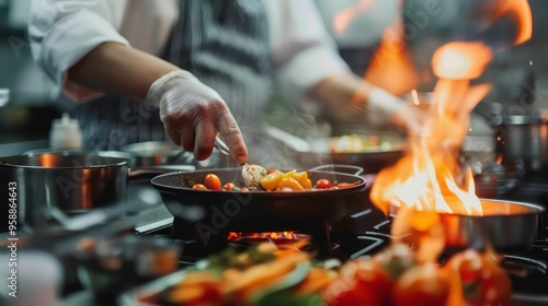 cooking, food, chef, hand, tongs, pan, kitchen, eatery, professional, meal, preparation, culinary, kitchen utensile, heat, flames, burner, vegetable, tomatoes, pepper, grill, dinner, breakfast, lunch, sauce, delicious, fresh, ingredient, tasty, home, closeup, stir fry, wok, cook, healthy, epicure, apron, kitchen equipment, food preparation, spatula, chopping, slicing