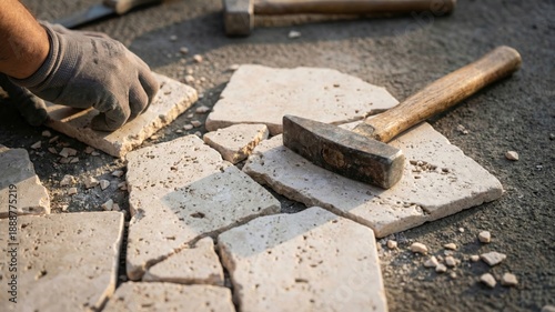 construction, men at work, hammer, paving, stone, hand, glove, renovation, industry, laying, pavement, tile, floor, masonry, concrete, craft, manual, job, occupation, site, groundwork, build, patio, path, paseo, equipment, tool, sledgehammer, hard, heavy, rough, texture, detail, restoration, repairing, uneven, travertine, limestone, broken, fragment, builder, installing, surface, labor, work, repair, ground, professional