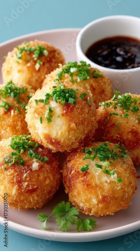 Close Up of Crispy Fried Croquettes Garnished with Green Herbs and Served with Dipping Sauce