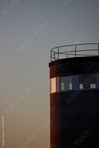 close up of cylinder building with sunset