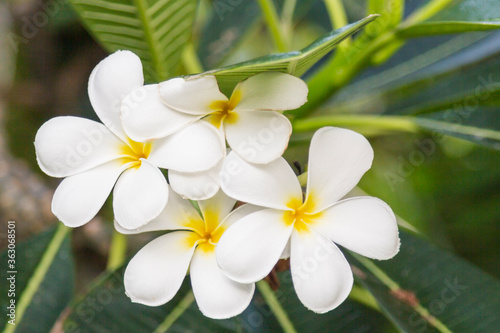 Close up of delicate, beautiful, white plumeria flowers