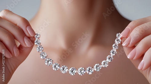 Close up of delicate hands holding a brilliant diamond necklace against soft skin. The diamonds sparkle against a neutral background.