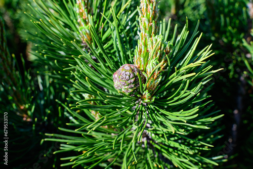 Close up of delicate small green leaves of pine conifer tree in a sunny spring garden, beautiful outdoor monochrome background photographed with selective focus.