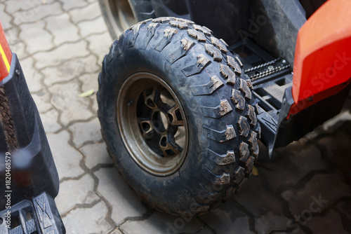 Close up of dirty black rubber tire on an all terrain vehicle. knobby wheel shows mud from off road driving adventure on powerful red quad bike parked on pavement