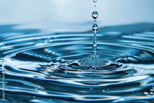 Close up of dripping water creating ripples on a blue water surface, perfect for backgrounds related to purity, freshness, and nature