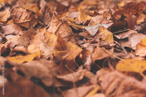 Close up of fallen autumn leaves in a forest in Mendoza, Argentina.