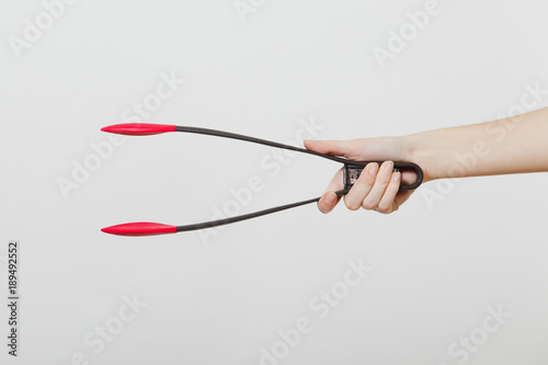 Close up of female hand horizontal holding black and red kitchen salat serving plastic pair of tongs isolated on white background. Kitchen utensils concept. Copy space for advertisement.