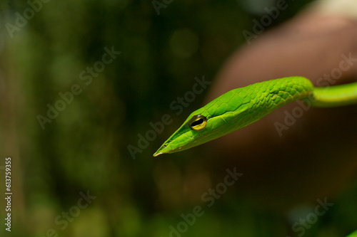 Close up of Fluorescent green vine snake in Anshi forest, Karnataka, India.