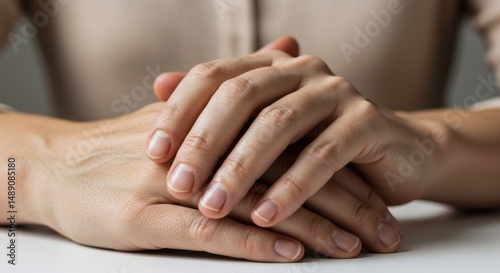 hand, folded, table, closeup, finger, skin, nail, white, beige, resting, intertwined, calm, waiting, anticipation, sharpened, concentration, detail, texture, neutral, person, body part, manicure, clean, smooth, caucasian, human, gesture, foreground, horizontal, indoor, studio, shot, photo, image, picture, still life