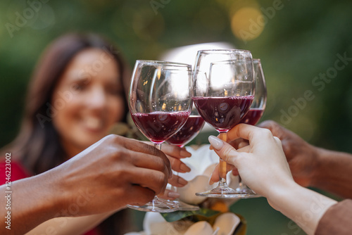 closeup, goggles, toast, hand, clinking, celebration, cheer, drink, red, wine, 4, people, raised, festive, party, together, group, event, social, occasion, clink, joy, happiness, gathering, wine glass, sharpened, red wine, alcohol, female, male, multiracial