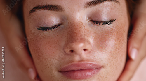 face, freckle, closeup, relax, massage, spa, skin, facial, comfort, calm, wellness, portrait, skincare, soft, hand, care, serene, gentle, emotion, beauty, relaxed, relaxation, texture, nourish, pore, calming, therapy, spa treatment, well-being, facial expression, soft focus, redhead, dermatology, adult