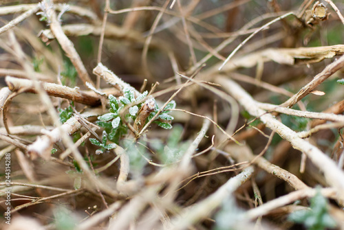 Close up of frozen lavender branches in winter