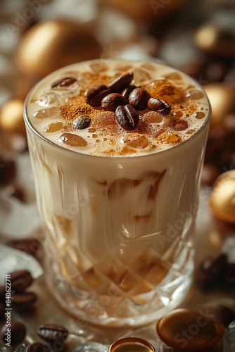 Close up of glass with iced coffee with coffee beans and hazelnuts scattered around it. This image, rich in detail and texture, is perfect for coffee product or coffee shop advertising